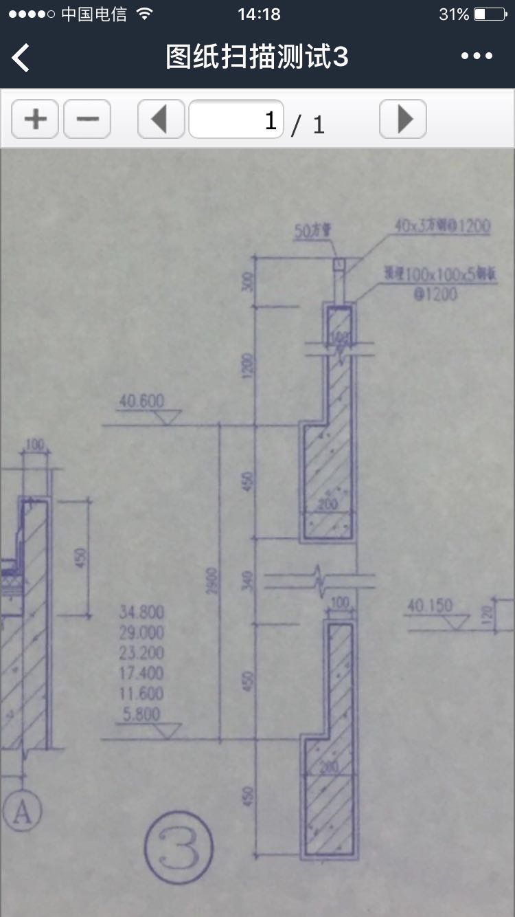 扫描的文件很清晰,效果还是很不错的,小编也扫描了一张图纸试试,若是图纸不是很大,扫描出来放大到局部,是可以看到数据,由于没有新图纸,测试的这张图纸是2006年的,所以原图本身有有些不清晰。