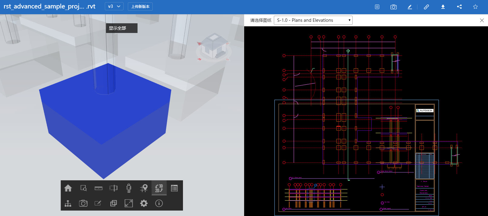 6、单模型文件浏览时增加二三维联动查看功能,允许查看在RVT中生成的二维图纸,并且实现点击图纸自动跳转显示对应的关联三维构件。