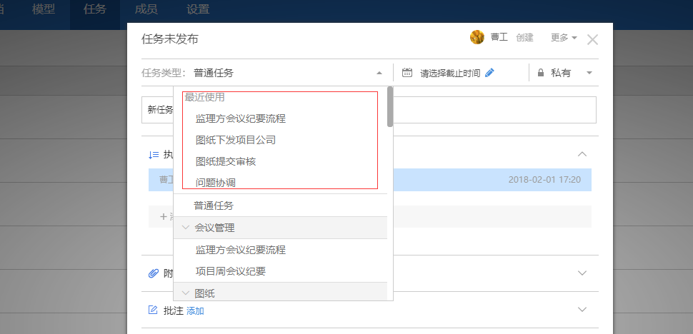 1.7 新增创建任务时选择最近使用过的流程模板功能,便于用户快速创建任务。