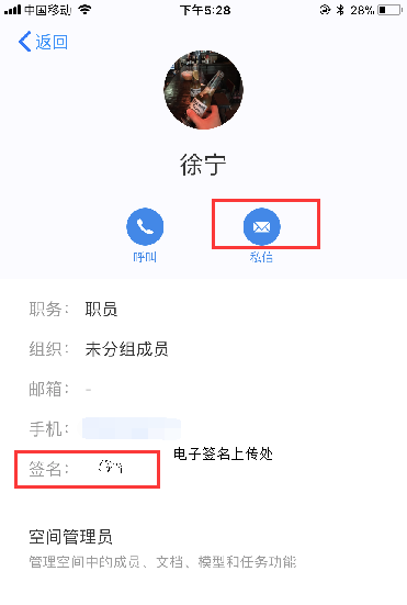 1.2 新增在成员详情中显示用户在移动端设置的手写签名的功能(设置-空间名片中也会展示自己的签名)