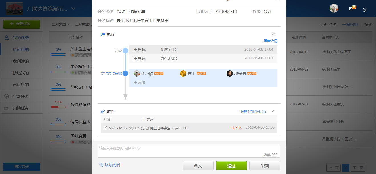 Step 1:流程发起人把需要签名的文件转化为PDF格式,作为附件上传,发布后,阶段执行人就可以看到需要签名的文件。